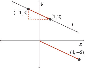 So we have a point and a slope. Beginning at the point \((-1,3)\) and using \(m=-\frac{1}{2}\), we determine a second point on the line. That is start at \((-1,3)\). Go down \(1\) and right \(2\) to the point \((1,2)\), and then sketch the line, \(l\).