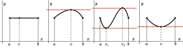 In the four diagrams, we see that within each open interval, there is at least one point \(x=c\) where \(f'(c )=0\). In other words, there exists at least one point where the tangent is horizontal. It was this idea that led to Rolle's theorem.