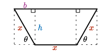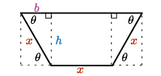 \[ \begin{align*} A&= bh + xh \\ &=\Bigr(x \cos{(\theta)}\Bigr)\Bigr(x \sin{(\theta)}\Bigr) + x \Bigr(x\sin{(\theta)}\Bigr) \\ &= x^{2} \cos{(\theta)}\sin{(\theta)} + x^{2} \sin{(\theta)} \end{align*} \]