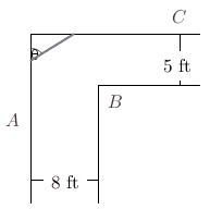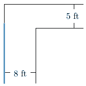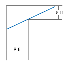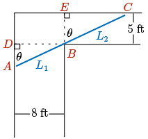 A pipe is to be carried down a hallway that is \(8\) ft wide. At the end of the hallway, there is a right-angled right turn into a narrower hallway that is only \(5\) ft wide.