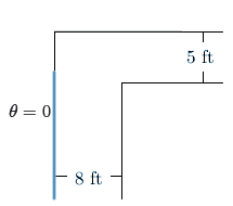 \(\theta=0\) will correspond to the very beginning once we've slid our pole all the way down that first wall so the front is touching the corner.