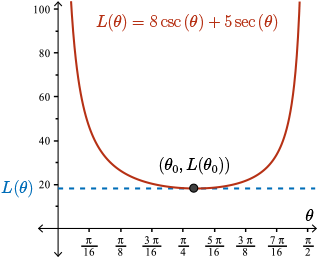Finally, we include a graph of the function \(L(\theta)=8\csc(\theta)+5\sec(\theta)\) for our reference.