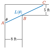 Using our calculator, we find \(L(\theta_{0}) \approx L(0.863413605) \approx 18.21953370\) and so the longest pipe that can make the turn measures approximately \(18.2\) feet.