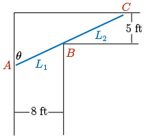 \[\cos{(\theta)}= \dfrac{EB}{BC} =\dfrac{5}{L_{2}} \Longrightarrow L_{2} = 5 \sec{(\theta)}\]\[L(\theta) = L_{1} + L_{2} = 8 \csc{(\theta)} + 5 \sec{(\theta)}\]
