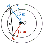 Now, since Bailey is running on the outer circle, the length of the segment \(BO\) is constant at \(15\) meters. Since Roger is running on the inner circle, the length \(RO\) is at a constant \(15 - 3\), or \(12\) meters. The third side of the triangle \(BR\) is changing with respect to time as they run. Similarly, the angle at the center between \(B\) and \(R\), \(\angle BOR\), is changing with respect to time.