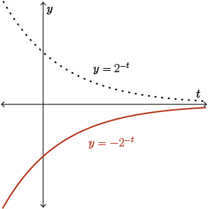 \(y = 2^{-t}\) is the decaying exponential function. So of course, the function \(y = -2^{-t}\) is this function reflected in the \(x\)-axis.