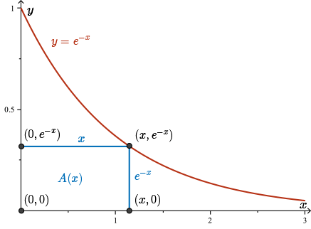 \[A(x) = \underbrace{\quad x\quad}_{\text{width}} \underbrace{\quad e^{-x}\quad}_{\text{height}}\]