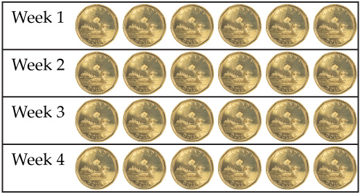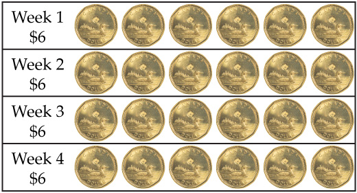 Your parents will pay you a total of \($24\), equally divided, over \(4\) weeks. How much do they pay you each week?