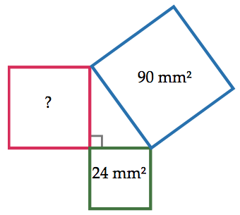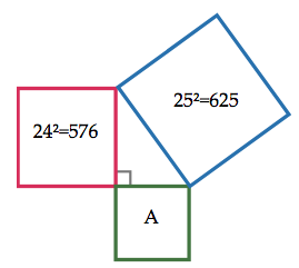 Using the Pythagorean Relationship, we know that the area of the square on the hypotenuse is equal to the sum of the area of the squares on the other two sides. So we write