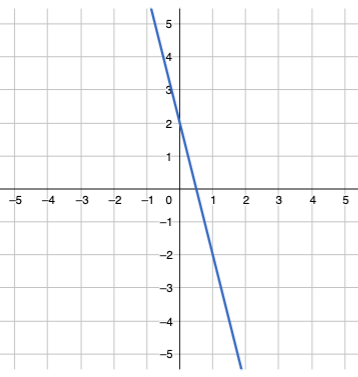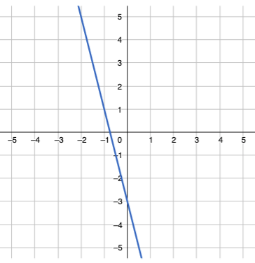 \(\begin{align*} m &=\dfrac{\text { rise }}{\text { run }} \\ &=\dfrac{-2-3}{\text { run }}=\dfrac{-2-3}{1-0} \\ &=\dfrac{-5}{1} \\ &=-5 \end{align*}\)