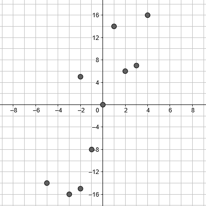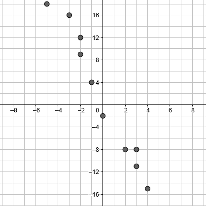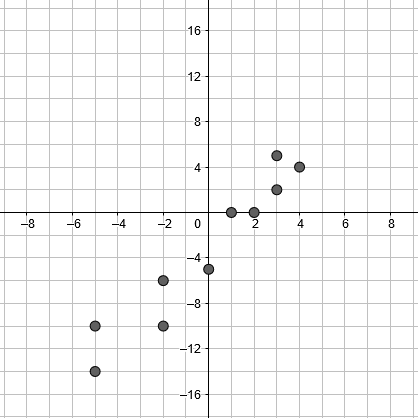 Our line of best fit passes through four points and has an equal number of points above and below it. (Recall from above: "Passing through" the point means that the line of best fit visually touches the point on the graph. Mathematically, this means that the distance between the point and the line is a very small value, ideally zero.)
