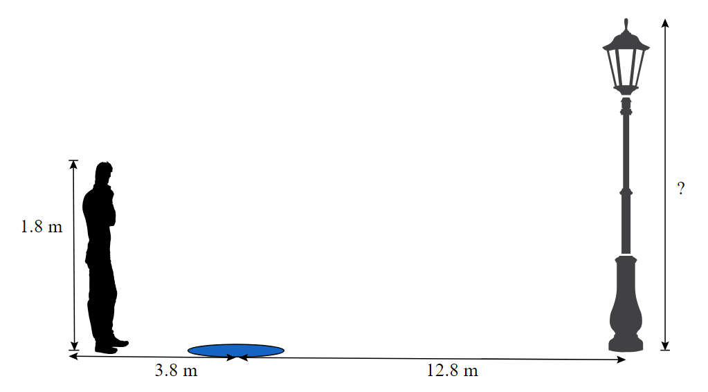 Rachael, who is \(1.7\) metres tall, is standing \(9\) metres from the base of a tree. She notices that the top of her shadow matches up with the tip of the shadow from the tree \(1\) metre from her feet. Determine the height of the tree.