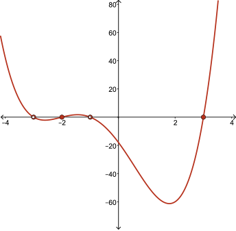 The zeros are at \(x=-3,-2,-1\), and \(3\) (all of multiplicity/order \(1\)). So the graph of the function will pass directly through the \(x\)-axis at each of these zeros.