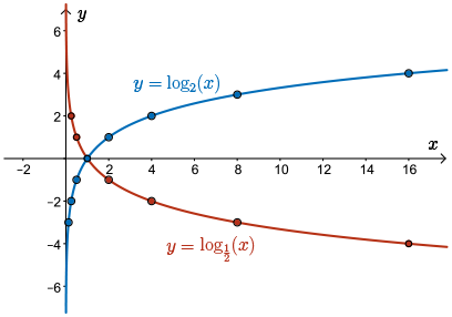 In the previous module, Logarithmic Functions, we determined graphically that \(\log_{\frac{1}{2}}(x) = -\log_{2}(x)\), since the graph of \(y = \log_{\frac{1}{2}}(x)\) is a reflection of \(y = \log_{2}(x)\) in the \(x\)-axis.