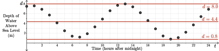 d. Determine an equation to model the depth, \(d\), of the water versus time, \(t\), over the \(24\)-hour period.
