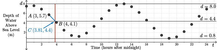 One way to do this is to draw a line segment connecting the point corresponding to the depth of the water at 3 hours, \(A~(3,5.7)\), to the point corresponding to the depth of the water at 4 hours, \(B~(4,4.1)\). This line segment intersects the central horizontal axis.