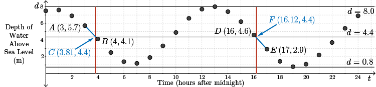 e. If a ship requires a minimum of \(5\) m of water to safely enter the harbour, on this particular day, determine the times in the \(24\)-hour period when it is safe for the ship to enter.