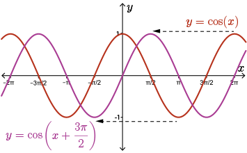 To verify this equivalence graphically, translate \(y = \cos(x)\) to the left \(\dfrac{3\pi}{2}\) units.