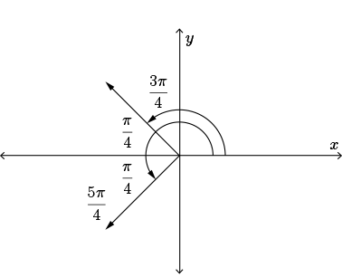 \[ \begin{align*} x &= \pi-\dfrac{\pi}{4} \text{ or } \pi+\dfrac{\pi}{4} \\ &= \dfrac{3\pi}{4} \text{ or } \dfrac{5\pi}{4} \end{align*} \]