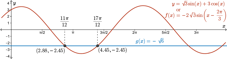 The graph of \(y = \sqrt{3}\sin(x) + 3\cos(x)\) is the same as the graph of \(y = -2\sqrt{3}\sin\left(x - \dfrac{2\pi}{3}\right)\) and this graph intersects the line \(y = -\sqrt{6}\) at approximately \(2.88\) and \(4.45\), or \(\dfrac{11\pi}{12}\) and \(\dfrac{17\pi}{12}\).