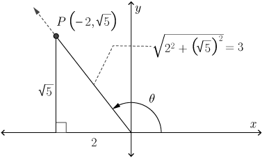 Using this information and the fact that \(\tan(\theta) = -\dfrac{\sqrt{5}}{2}\), we know that the terminal arm passes through the point \(P\,\left(-2,\sqrt{5}\right)\).