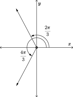 Thus, \(\theta = \pi - \dfrac{\pi}{3} = \dfrac{2\pi}{3}\) or \(\pi + \dfrac{\pi}{3} = \dfrac{4\pi}{3}\).