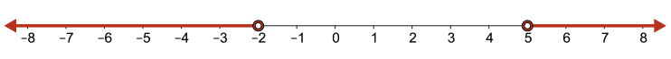 Image Description: A number line has a open circle at \(-2\) with an arrow extending in the direction of \(-\infty\). There is another open circle at \(5\) with an arrow extending in the direction of \(\infty\).