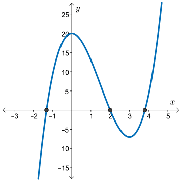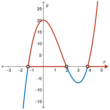Using these zeros and the end behaviour of the cubic, \(g(x)=2x^3-9x^2+20\), we can sketch the graph and determine when \(g(x) \gt 0\); that is, when the function is above the \(x\)-axis.