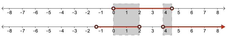 Hence, \(0 \lt x \lt 2 \) or \( \dfrac{5 + \sqrt{105}}{4} \lt x \lt 4.5 \).
