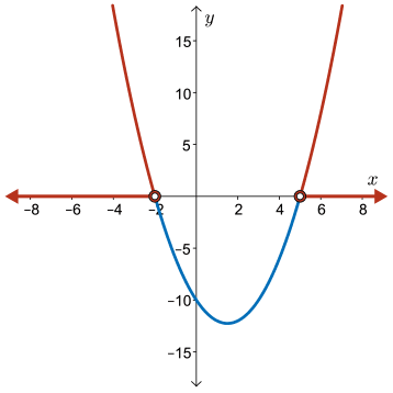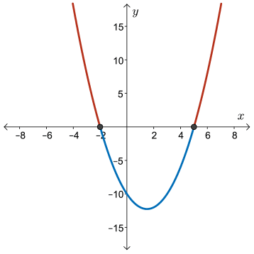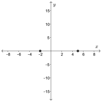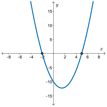 To graph this function, we identify the zeros, or \(x\)-intercepts, as \(x = -2\) and \(x = 5\).