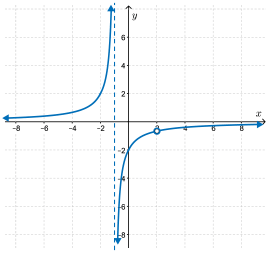Note also that using the simplified equation and ignoring the restriction \( x \neq 2 \), \( f(2) = \dfrac{-2}{2 + 1}=-\dfrac{2}{3} \), the \( y \)-coordinate of the point of discontinuity. This rational function has a horizontal asymptote of \(y=0\). We will discuss horizontal asymptotes and the behavior of a function near its horizontal asymptote in the next module on end behavior asymptotes.